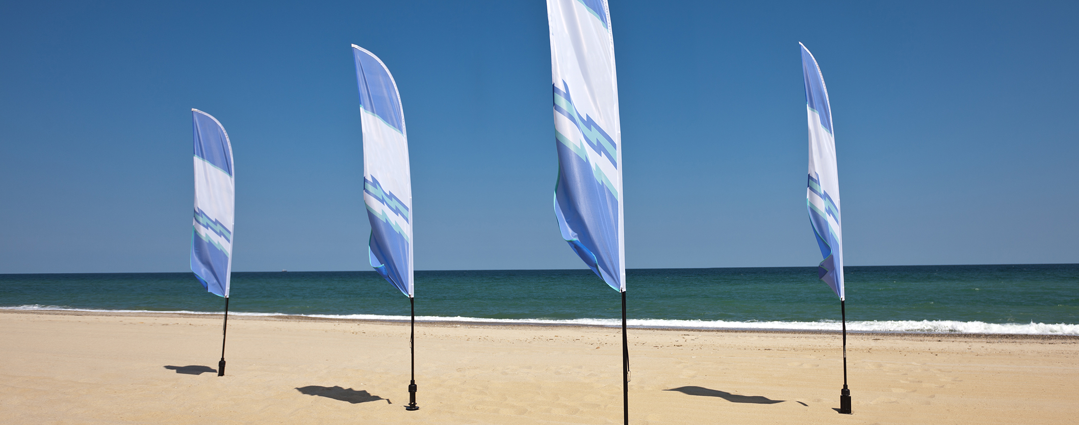 Val op en kleed uw evenement aan met beachflags. Niet alleen op het strand maar ook op beurzen, bij winkelcentra en in kantoren blijft dit een fantastische reclamedrager. In 4 maten en in diverse modellen leverbaar, compleet met passende plaatsingsmethode zoals parasolvoeten, voetstandaards of grondschroef.