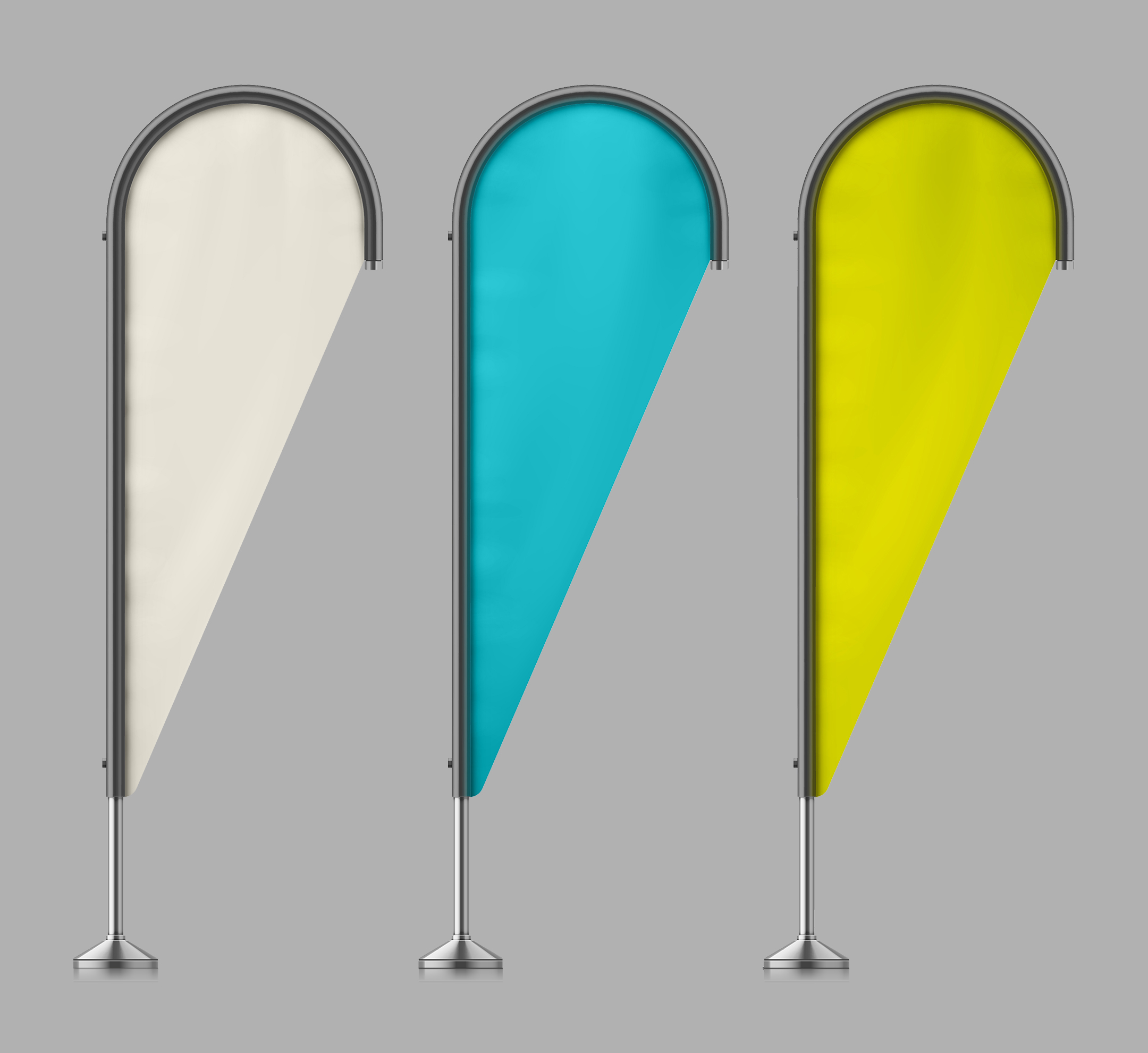 Druppelvlaggen zijn een variatie op de beachflag. Voordeel is de grote bedrukbare oppervlakte aan de bovenzijde van het doek. Hierdoor kunnen vaak de logo’s net even wat groter. Er zijn nog meer variaties mogelijk; vraag meer informatie.